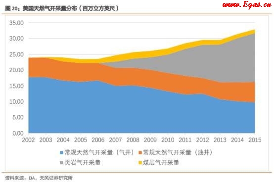 2002年之前,美國非常規(guī)天然氣的產(chǎn)量非常小,幾乎可以忽略。2002年之后,美國常規(guī)天然氣的產(chǎn)量出現(xiàn)了明顯下滑的趨勢。在煤層氣鉆井技術(shù)提高和政府財政補貼支持的雙重作用下,美國煤層氣產(chǎn)業(yè)在2002年之后進(jìn)入了快速發(fā)展期,彌補了常規(guī)天然氣產(chǎn)量下滑的缺口。隨著頁巖氣革命的爆發(fā),2009年美國以6240億立方米的產(chǎn)量首次超過俄羅斯成為世界第一天然氣生產(chǎn)國,頁巖氣的產(chǎn)量快速爆發(fā),產(chǎn)量幾乎與常規(guī)天然氣相當(dāng)。而煤層氣的產(chǎn)量則逐步穩(wěn)定下來且略有下降。