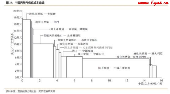 從供給端各類型天然氣的成本來看,煤層氣的成本介于陸上常規(guī)天然氣和管道進(jìn)口天然氣之間,遠(yuǎn)小于同為非常規(guī)國產(chǎn)天然氣的頁巖氣。由于液化天然氣(LNG)運輸較靈活,所以隨著國際油價和天然氣價格的波動,進(jìn)口液化氣(LNG)也相對波動比較大。