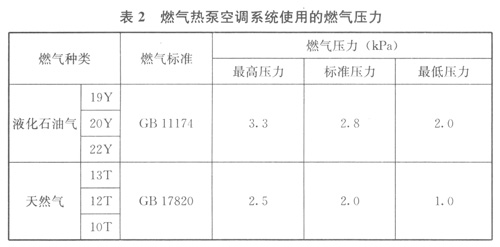 225現(xiàn)行國家標(biāo)準(zhǔn)《燃?xì)獍l(fā)動機(jī)驅(qū)動空調(diào)(熱泵)機(jī)組》GBT 22069—2008中第612條規(guī)定了燃?xì)鉄岜每照{(diào)機(jī)組使用的燃?xì)鈮毫θ绫?/span>2所示。