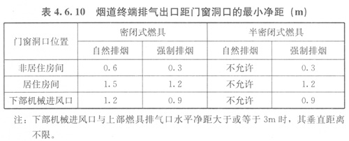 4.6.10穿外墻的煙道終端排氣出口距門窗洞口的最小凈距應(yīng)符合表4.6.10的規(guī)定。距地面的垂直凈距不得小于0.3m。煙道終端排氣出口應(yīng)設(shè)置在煙氣容易擴(kuò)散的部位。