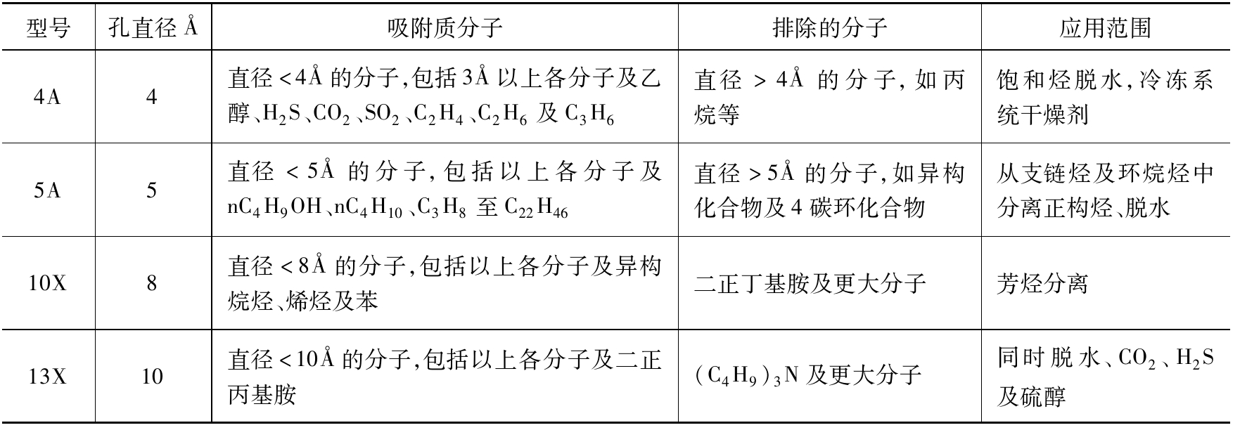 不同型號的分子篩的特性見表2-5。