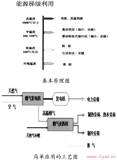 根據(jù)“高能高用、低能低用、溫度對口、梯度利用”的原理,對天然氣燃燒產(chǎn)生的高溫煙氣,通過發(fā)電機來提供高品位的電能,對發(fā)電機排出的煙氣,根據(jù)用戶的需求,或產(chǎn)生蒸汽、熱水,或轉(zhuǎn)換成冷能,或用于除濕,從而將天然氣所含的能量盡可能地“吃盡榨干”,從而實現(xiàn)能源的高效利用,同時也達到較好的經(jīng)濟性。