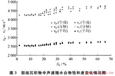 水合物的微觀分布對沉積物的聲學性質(zhì)具有重要影響:在固結(jié)沉積物中,由于在孔隙流體中生成,0~10%飽和度的水合物對聲速影響甚小;在松散沉積物中,由于水合物膠結(jié)沉積物顆粒生成,微量的水合物(飽和度1%左右)使縱波速度陡增。這表明,了解水合物的微觀分布對水合物資源估算具有重要的指導作用。