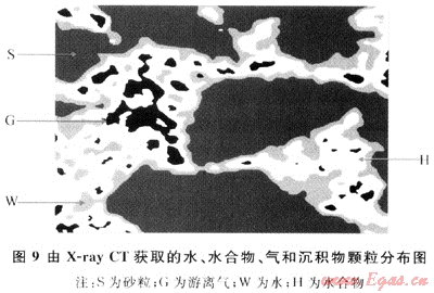本文利用聲學探測成功研究了水合物的微觀分布,在將來的應用上可能更具有普遍性。但是,其不足之處是不能直接觀測沉積物中的水合物微觀分布。因此,如果能將X射線斷層掃描技術(shù)結(jié)合起來研究,將對水合物的勘探、資源評價及其形成機制等具有更重要的指導意義。