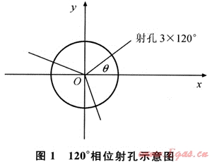 圖1中采用120°相位射孔完井,在得到任意射孔方位角對應(yīng)的破裂壓力下,3個射孔處對應(yīng)的破裂壓力分別為p1,p2,p3;某個角度對應(yīng)的破裂壓力應(yīng)該為3個孔中對應(yīng)最小的破裂壓力,即min(p1,p2,p3),據(jù)此可以做出任意角度θ對應(yīng)的破裂壓力,也就得到了該相位射孔井在該地層對應(yīng)的破裂壓力變化范圍。