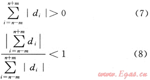 式(7)說明在第n個(gè)點(diǎn)附近存在較大變化,在滿足式(7)的同時(shí)滿足式(8)說明在該點(diǎn)附近也存在較大的反向變化,可判斷為“跳動(dòng)”。