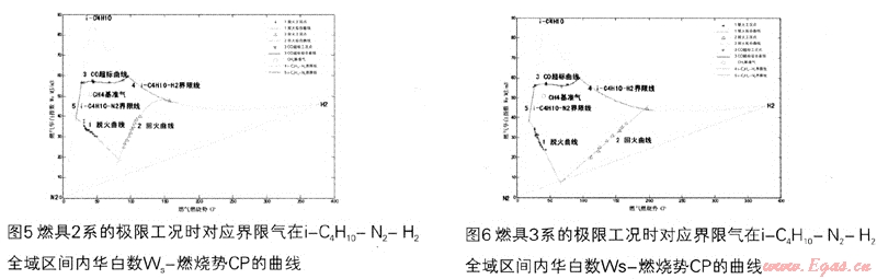 同理可以測(cè)得燃具2系、3系、……、5系等不同燃具的氣質(zhì)適應(yīng)域。各系列燃具在極限燃燒工況下對(duì)應(yīng)華白數(shù)Ws-燃燒勢(shì)CP在i-C4H10-N2-H2區(qū)間內(nèi)的曲線分別見(jiàn)圖5~8