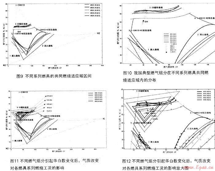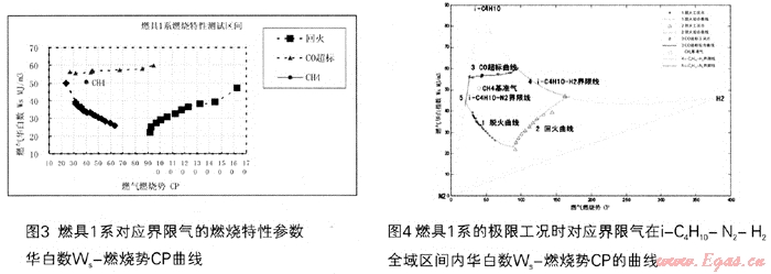 如前述圖3~8所示,以燃?xì)馊A白數(shù)顫、燃?xì)馊紵齽?shì)CP兩個(gè)參數(shù),建立的坐標(biāo)圖形,可以得到比較平滑的脫火、回火及CO超標(biāo)等極限燃燒特性曲線,并可形成比較穩(wěn)定的燃?xì)饩哌m應(yīng)性封閉區(qū)域。