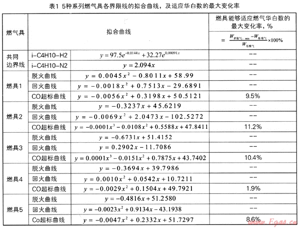 根據(jù)實(shí)驗(yàn)測(cè)得的各系列燃具在界限工況時(shí)對(duì)應(yīng)界限試驗(yàn)氣的組分?jǐn)?shù)據(jù),計(jì)算得到對(duì)應(yīng)燃?xì)獾娜紵匦詤?shù),及圖3~8所示的各特性曲線,進(jìn)行回歸分析與曲線擬合,其擬合曲線見(jiàn)表6。