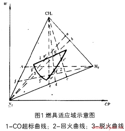 開(kāi)發(fā)設(shè)計(jì)燃具時(shí),首先要決定使用某類燃?xì)狻8鶕?jù)某類燃?xì)獾幕鶞?zhǔn)氣[1]設(shè)計(jì)、生產(chǎn)后按照基準(zhǔn)氣及界限試驗(yàn)氣的要求(包括壓力)調(diào)整檢驗(yàn)出廠。當(dāng)燃?xì)庑再|(zhì)(成分)發(fā)生變化時(shí),其工作狀態(tài)必然改變。如果燃?xì)獬煞肿兓谀骋唤缦薹秶鷥?nèi),它仍能保持正常工作。這就是燃具對(duì)燃?xì)獬煞肿兓倪m應(yīng)能力,稱為燃具的適應(yīng)性。每個(gè)燃具都有一定的適應(yīng)能力。量化這個(gè)適應(yīng)能力,可以用燃具適應(yīng)燃?xì)獬煞肿兓姆秶鷣?lái)表示。適應(yīng)燃?xì)獬煞肿兓姆秶鷧^(qū)間稱為燃具適應(yīng)域。適應(yīng)域的范圍越寬,表示燃具的適應(yīng)燃?xì)鈿赓|(zhì)變化的能力越強(qiáng)[2]。