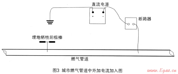 城市燃?xì)夤艿琅c長(zhǎng)輸燃?xì)夤艿老啾龋季謴?fù)雜,支管多,管道周圍干擾因素多,燃?xì)庑孤┰斐傻奈:Υ?,必須?duì)城市燃?xì)夤芫W(wǎng)進(jìn)行定期的防腐層檢測(cè),確保安全[4]。目前我國(guó)的城市燃?xì)夤芫W(wǎng)陰極保護(hù)主要采取犧牲陽(yáng)極方法,而DCVG檢測(cè)技術(shù)需要外加電源,所以應(yīng)用時(shí)須在燃?xì)夤艿乐屑又绷麟娏?。直流電源的外加如圖3所示:可調(diào)節(jié)的直流電源正極接地,負(fù)極通過(guò)閥門測(cè)試樁或閥門井與燃?xì)夤艿辣谶B接,負(fù)極與燃?xì)夤艿乐g接電路通斷器來(lái)實(shí)現(xiàn)管路電流的周期性通斷。