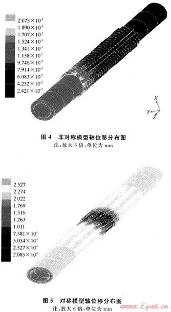 圖4和圖5給出了兩種模型軸向位移分布圖,從圖中可以看出:對(duì)稱結(jié)構(gòu)的中軸受剪效果明顯優(yōu)于非對(duì)稱結(jié)構(gòu),各部分位移分布也更合理,在隨鉆安全接頭的設(shè)計(jì)中宜用對(duì)稱結(jié)構(gòu)。