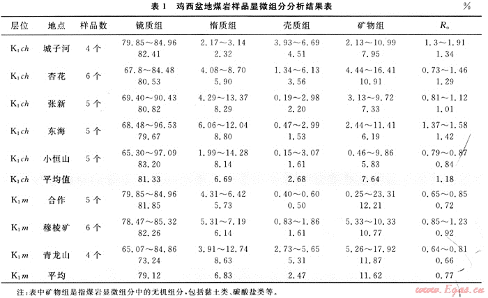 通常把煤中各種復雜的顯微有機組分按其性質和成因劃歸3個組,即鏡質組、殼質組和惰質組,以鏡質組為主的腐殖煤形成的干酪根為腐殖型干酪根,通常是主要的生氣成分[2]。對雞西盆地8個礦區(qū)共40個樣本進行煤巖顯微組分分析(分析結果見表1),殼質組含量很低,城子河組范圍值為0.15%~6.69%,均值為2.68%;穆棱組范圍值為0.40%~5.65%,平均值為2.47%;鏡質組含量普遍大于70%,城子河組平均值為81.33%,穆棱組平均值為79.12%,所以煤層不具備生油的物質基礎但具備良好的生氣條件。鏡質組反射率(Ro)是確定有機質成熟度的重要指標。城子河組煤巖樣本鏡質體反射率的范圍為0.65%~1.91%之間,平均為1.18%,基本屬于肥、焦煤階段,穆棱組鏡質體反射率的范圍為0.64%~1.23%之間,平均為0.77%,基本屬于氣、肥煤階段。兩個組有機質演化均達到“低-中成熟”階段,處于“石油窗”內,可以大量生氣。