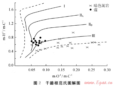 干酪根元素是劃分有機質類型的重要指標,對雞西泥巖和煤巖進行元素分析,原子比值統(tǒng)計暗色泥巖H/C為0.30~0.9,O/C為0.04~0.34;煤H/C為0.52~0.79,O/C為0.05~0.09;在范氏圖解中反映主要為腐殖型干酪根,部分為含腐泥的腐殖型,也反映主要以生氣為主[4](圖2)。