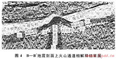 陸西地區(qū)某地震剖面(圖4)呈北東-南西向分布,地震剖面位置見(jiàn)圖5中B-B′。在該剖面中部可見(jiàn)一個(gè)內(nèi)部為雜亂和空白反射結(jié)構(gòu)的柱狀-蘑菇狀反射體,該反射體頂部具有明顯的不規(guī)則的蘑菇狀外形,下部為一個(gè)斷續(xù)-雜亂的柱狀反射體。其內(nèi)部反射特征為強(qiáng)振幅、低頻率的雜亂反射,內(nèi)部結(jié)構(gòu)常成丘狀的短反射,同相軸多產(chǎn)生扭曲,難以追蹤,視頻率較低,波軸變寬。在蘑菇狀反射體的兩端可見(jiàn)平行結(jié)構(gòu),頂端具有明顯的上超構(gòu)造,兩端具有披覆構(gòu)造。根據(jù)地質(zhì)和地震反射特征,筆者初步把該區(qū)域定為火山通道相的火山巖體。