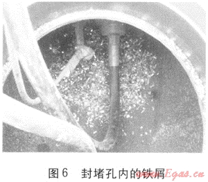 ② 管道開孔過程中產(chǎn)生的鐵屑很明顯(見圖6),除部分細微顆粒或粉末立即被氣流吹到下游,依舊有部分較大塊的鐵屑暫時殘留在三通管件周圍,如施工單位或設(shè)備制造單位能設(shè)計一種專用工具(如磁性探棒),設(shè)法取出大部分殘留的鐵屑,將對下游設(shè)備安全穩(wěn)定運行產(chǎn)生深遠意義。