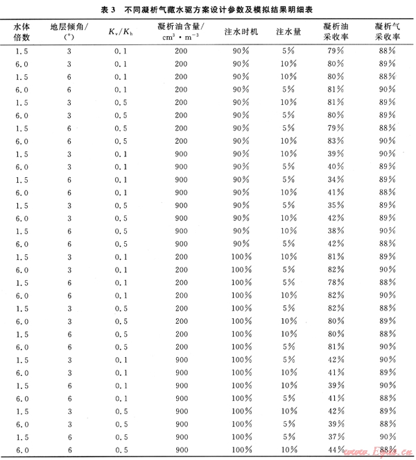 在前面凝析氣藏水驅(qū)方案確定之后,利用Eclipse數(shù)值模擬軟件的組分模擬器E300對其進(jìn)行了模擬運(yùn)算,其結(jié)果見表3。