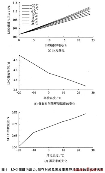 由圖6可知,環(huán)境溫度越高,LNG儲罐內(nèi)壓力上升得越快,在一定的LNG儲罐承壓范圍內(nèi),LNG的儲存時(shí)間越短,蒸發(fā)率也就越大。
