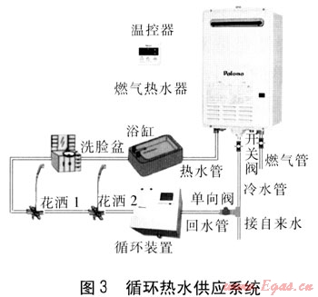 第二種方案:熱水器依然安裝于戶外陽臺,另為熱水器添置一套循環(huán)裝置(含小型水泵、水溫設(shè)定及感應(yīng)裝置、顯示屏等),組成一個家用中央循環(huán)熱水供應(yīng)系統(tǒng)(見圖3)。用戶在每次使用熱水之前,只要先開啟室內(nèi)任意一個熱水出水口的水龍頭,流水約1~2s再關(guān)閉,這樣就給了循環(huán)水泵一個啟動運行的信號,循環(huán)水泵開始自動循環(huán)。熱水器的水流感應(yīng)器感應(yīng)到水流就會啟動燃燒。當(dāng)循環(huán)水泵機盒感應(yīng)器感應(yīng)到循環(huán)管路中水溫上升到預(yù)先設(shè)定的溫度,如40℃時,循環(huán)水泵就會自動停止工作。然后,要使用熱水時一開水龍頭即時就有設(shè)定水溫的熱水出來了。相應(yīng)冷熱水循環(huán)管道需于樓宇建造期間預(yù)先暗埋敷設(shè),而熱水管最好能適當(dāng)絕熱。