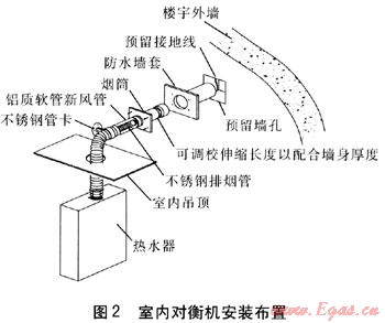 然而,對衡機有關(guān)煙管的安裝位置需于樓宇建造期間預(yù)先留好孔洞,且保證煙管長度盡可能短,煙管的彎頭數(shù)量盡可能少(而強制排煙式熱水器的煙管最大長度、彎頭最大數(shù)目等,應(yīng)遵照制造商的指引)。室內(nèi)對衡機安裝布置見圖2。