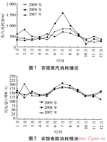 賓館用能有蒸汽、天然氣、電。由于備用燃氣鍋爐一般情況下不運行,烹飪耗天然氣量根據(jù)入住率變化較大,因此本文不考慮天然氣的消耗。圖1、2分別為2007—2009年蒸汽和電的消耗情況。