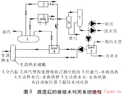 ③ 冬季蒸汽凝結(jié)水溫度達到90℃以上,且凝結(jié)水量較大,僅供給洗衣房使用是不合理的,還可以用于加熱生活熱水、廚房洗滌用水等,這樣將節(jié)省大量能源。改造后的凝結(jié)水利用系統(tǒng)流程見圖3。經(jīng)供暖汽-水換熱器、生活熱水汽-水換熱器換熱后的高溫凝結(jié)水經(jīng)單向閥流向自動加壓器,經(jīng)加壓后送往凝結(jié)水回收器中,然后送到廚房、洗衣房以及生活熱水水-水換熱器中制備生活熱水。當生活熱水需求量較小時,可單獨采用生活熱水水-水換熱器,需求量較大時可同時采用兩臺換熱器。