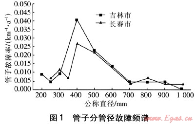 ① 吉林和長春兩座城市的熱網(wǎng)管子分管徑故障率變化趨勢基本一致,即隨著管徑的減小而增大,當(dāng)管子規(guī)格為DN 350~450mm時故障率達(dá)到高峰。