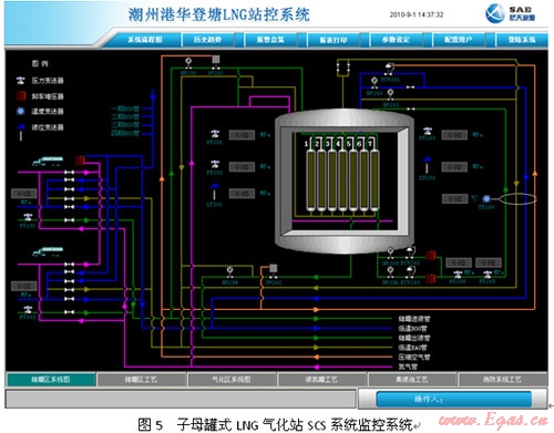 SAE-LSMS系統(tǒng)已成功在國內(nèi)應(yīng)用多年,2005年深圳美視電廠總管式增壓40kfg,氣化量48,000NM3/H,2007年深圳燃?xì)饧瘓F(tuán)梅林LNG應(yīng)急調(diào)峰站單元式增壓20kfg,氣化量小時40,000NM3/H,2008年南京港華兩個2500立方LNG子母罐氣化站均已應(yīng)用該系統(tǒng)。均取得了較好的效果。圖5為廣東潮州子母罐式LNG氣化站SCS系統(tǒng)監(jiān)控畫面。