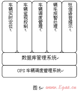 GPS系統(tǒng)主要功能有車輛實(shí)時(shí)定位、車輛監(jiān)視控制、車輛調(diào)度管理、車輛報(bào)警處置、短信語音通信等。功能結(jié)構(gòu)見圖5:
