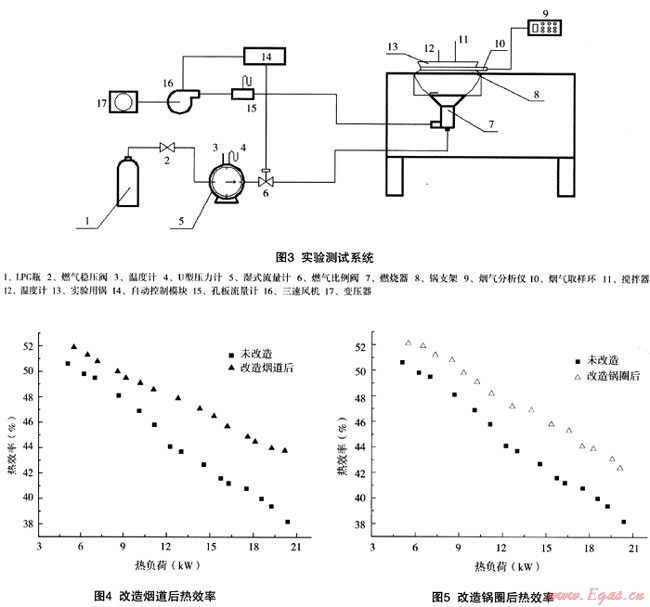 為對比改造前后中餐灶熱效率,在原有額定負荷為18kW的紅外中餐燃氣灶的基礎上對爐膛進行煙道、鍋圈和爐膛結(jié)構(gòu)的改造,并對改造后的熱效率進行測試,實驗裝置的布置和流程如圖3所示。