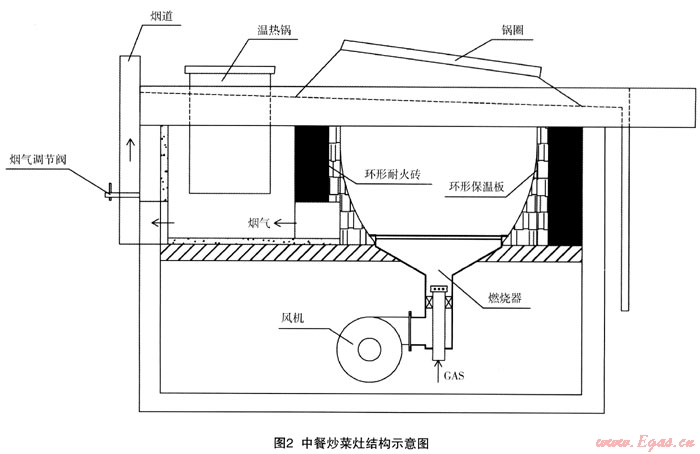 圖2為中餐灶結(jié)構(gòu)示意岡,爐膛結(jié)構(gòu)主要影響煙氣對流換熱,煙氣主要分為兩部分:一是經(jīng)鍋圈排煙氣,其對熱效率影響較大;二是經(jīng)煙道排炯氣,其一般加熱溫鍋灶后再排出,排煙溫度約在200℃以上。經(jīng)過鍋圈流出煙氣主要是以對流方式加熱鍋底和鍋側(cè),提高速度有利于提高對流換熱,則鍋與爐膛耐火保溫材料間隙、鍋圈與鍋之間間隙成為重要因素。另外,兩股氣流的分配也影響到中餐灶的熱效率。