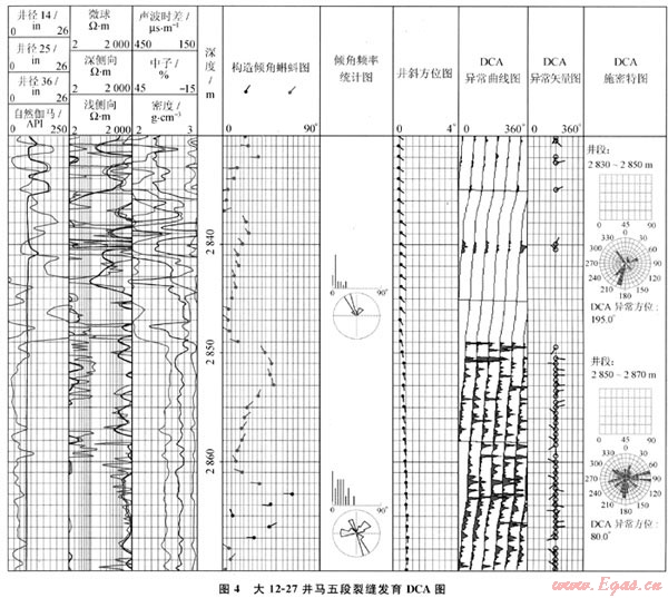 利用地層傾角測井識別裂縫效果較好,電導率異常檢測(DCA)求出由各極板與相鄰兩個極板的電導率的最小正差異,把這個最小正差異疊加在該極板的方位曲線上,作為判斷裂縫的標志。DCA成果圖直接顯示出裂縫的方位,排除了由地層層理等引起的電導率異常,突出了與裂縫相關(guān)的電導率異常。