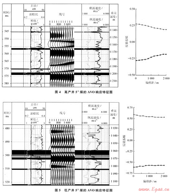 通過對煤層氣井的AVO數(shù)值模擬,獲得井的AVO信息,將此信息同地震測線AVO屬性進(jìn)行比較,以尋找AVO異常區(qū)。選擇離地震測線較近的井進(jìn)行AVO正演數(shù)值模擬,從井旁CDP道集中反復(fù)提取地震子波,使提取的地震子波與反射系數(shù)進(jìn)行褶積,得到合成CDP道集。將合成CDP道集與實際CDP道集進(jìn)行比較,誤差值最小的CDP道集即為最終合成CDP道集。然后對其進(jìn)行AV0反演處理,獲得截距、梯度屬性剖面。在AVO正演數(shù)值模擬獲得的合成CDP道集上,對應(yīng)5#煤層的同相軸展示了振幅隨偏移距增大而減小的特征,和AVO反演結(jié)果對應(yīng)的關(guān)系是:對于負(fù)同相軸,是負(fù)截距、正梯度異常;對于正同相軸,是正截距、負(fù)梯度異常,這正是煤層氣富集的反映。