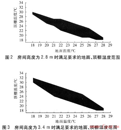 對于房間高度分別為2.8、3.1、3.4、3.7m的房間模型,根據(jù)模擬結果,求出0.5、1.8m斷面上平均PPD,將滿足要求的地面、頂棚溫度點繪成圖形。其中,2.8m、3.4m高房間的溫度范圍見圖2。