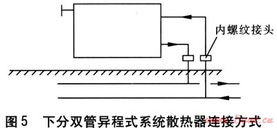 下分雙管異程式系統(tǒng)適用于中小面積戶型,如兩室兩廳兩衛(wèi),建筑面積約120m2,其調節(jié)性能優(yōu)于下分單管式系統(tǒng)。散熱器連接方式見圖5,供回水塑料管由三通引出后,采用內螺紋接頭與地面上鍍鋅鋼管連接,但此處需預留施工槽,以便檢修三通管件。