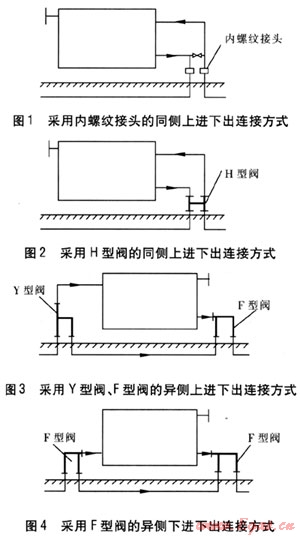 散熱器連接方式推薦采用以下4種:a.同側上進下出(見圖1),塑料管出地面后,采用內螺紋接頭與地面上鍍鋅鋼管連接,安裝簡單,造價低,出地面只有一處,工程中經常采用。b.同側上進下出(見圖2),塑料管出地面后,采用H型閥與地面上鍍鋅鋼管連接,安裝簡單,出地面只有一處,但H型閥價格高,工程中較少采用。c.異側上進下出(見圖3),塑料管出地面后,采用Y型閥和F型閥與地面上鍍鋅鋼管及散熱器連接,出地面有兩處,造價高。d.異側下進下出(見圖4),塑料管出地面后,采用兩個F型閥與地面上散熱器連接,出地面有兩處,造價高。