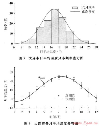 通過(guò)對(duì)大連市多年來(lái)溫度數(shù)據(jù)的分析發(fā)現(xiàn),在大連地區(qū)一年中,每個(gè)月的日平均溫度(T)近似服從正態(tài)分布,如圖3所示。該分布的期望為T(mén)m,方差為σm2,即:T~N(Tm,σm2),其中,Tm因月份的不同而不同,σm2則在全年中波動(dòng)較小,如圖4所示。