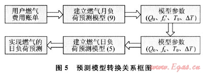 通常,燃?xì)庳?fù)荷的月負(fù)荷預(yù)測(cè)模型比較容易建立。因?yàn)?,通過(guò)統(tǒng)計(jì)待預(yù)測(cè)地區(qū)的月燃?xì)赓M(fèi)用賬單,就能夠比較方便地建立月負(fù)荷預(yù)測(cè)模型。相反,由于目前我國(guó)城市燃?xì)庳?fù)荷計(jì)量體系尚不完備,因此燃?xì)馊肇?fù)荷計(jì)量數(shù)據(jù)的收集較為困難,這也給燃?xì)馊肇?fù)荷的預(yù)測(cè)帶來(lái)諸多不便。所以我們可以利用上述方法,通過(guò)預(yù)測(cè)模型(9)來(lái)間接地得到燃?xì)馊肇?fù)荷預(yù)測(cè)模型,從而實(shí)現(xiàn)燃?xì)馊肇?fù)荷預(yù)測(cè)。其轉(zhuǎn)換關(guān)系如圖5所示。