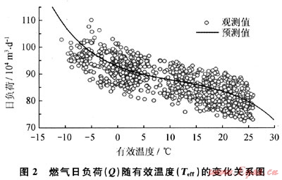 根據(jù)大連市近年來(lái)燃?xì)馊肇?fù)荷的觀測(cè)數(shù)據(jù),繪制工作日期間燃?xì)馊肇?fù)荷(Q)隨有效溫度(Teff)的變化關(guān)系曲線,如圖2所示。