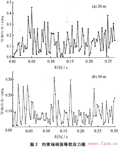 從20m和30m的射孔管柱約束端端面等效應力數(shù)據(jù)圖看出(圖2),都存在正值的拉伸應力,重力載荷對射孔管柱產(chǎn)生了預應力作用,隨后應力從正值開始降低而來回震蕩,這個階段射孔沖擊載荷對射孔管柱起作用了。20m射孔管柱模型計算結果的等效應力的最小值σmin=6.98MPa,最大值σmax=449.92MPa;而30m射孔管柱模型計算結果的等效應力最小值σmin=6.81MPa,最大值σmax=311.98MPa。