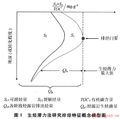 排烴門限理論在逐步完善和發(fā)展中,逐漸形成了利用生烴潛力來研究排烴門限計算排烴強度及排烴量的方法。生烴潛力法是根據(jù)烴源巖中的有機質(zhì)在生排烴前后質(zhì)量不變的原理,依照烴源巖的生烴潛力在沉積剖面上的變化規(guī)律來研究烴源巖排烴特征的一種方法。利用烴源巖熱解資料采用一個綜合熱解參數(shù)——生烴潛力指數(shù)[(S1+S2)/T0C]來表征烴源巖的生烴潛力。沒有油氣排出時烴源巖的生烴潛力稱為原始生烴潛力;油氣排出后,生烴潛力逐漸減小,稱此時的生烴潛力為剩余生烴潛力。烴源巖的生烴潛力指數(shù)在演化過程中開始減小,表明有烴類大量排出,而開始減小時的埋深條件代表了烴源巖的排烴門限,此時的生烴潛力指數(shù)為烴源巖的最大生烴潛力指數(shù)。烴源巖最大生烴潛力指數(shù)與剩余生烴潛力指數(shù)的差值為排烴率(qe),即烴源巖達到排烴門限后單位有機碳排出的烴量(mg/g);Qe代表了烴源巖在地質(zhì)熱演化史過程中累積排出的烴量(圖1)。