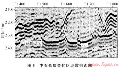 由圖7可見,在中石膏層受擠壓消失或減薄的區(qū)域,碳酸鹽巖頂?shù)捉缑嬖跁r(shí)間剖面上出現(xiàn)下拉,形成“眼球”;如果鹽巖中存在石膏夾塊,則引起下覆碳酸鹽巖頂?shù)追瓷渫噍S錯(cuò)斷,這顯然會使解釋進(jìn)入誤區(qū)。由此可提示,在石膏層變形較強(qiáng)烈的地區(qū),地震解釋要特別關(guān)注中石膏缺失和減薄的區(qū)域。