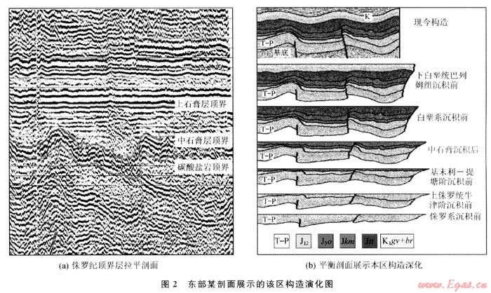 在上侏羅統(tǒng)卡洛夫-牛津階沉積完畢之后,圖蘭地臺回返,中央卡拉庫姆隆起抬升,而阿姆河盆地區(qū)域則繼續(xù)沉降,由此形成了盆地區(qū)域內(nèi)封閉的海洋沉積環(huán)境。沉積了巨厚的鹽膏層。從地震剖面上可以清楚地反映出該套鹽膏層受擠壓后流動變形的形態(tài),以往的認(rèn)識認(rèn)為[4],鹽膏層發(fā)生塑性流動的擠壓力是由晚古近世開始的新構(gòu)造運動作用的結(jié)果。但通過平衡剖面和層拉平剖面技術(shù)清晰地反映出了在該套鹽膏層中部的中石膏沉積完畢之后即發(fā)生一期強(qiáng)烈的構(gòu)造運動,該期構(gòu)造運動不僅僅使鹽膏層發(fā)生塑性流動而形變。更重要的是本區(qū)的構(gòu)造格局因此而改變,同時本區(qū)部分構(gòu)造圈閉也在此時形成。