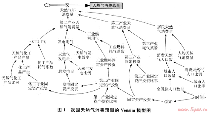天然氣消費(fèi)是一個(gè)復(fù)雜的非線性系統(tǒng),影響因素眾多。目前大多數(shù)以計(jì)量模型為基礎(chǔ)的預(yù)測方法只能考慮到兩到三方面的影響因素[1~6]。為了能夠更準(zhǔn)確地預(yù)測我國天然氣消費(fèi)量,本文采取系統(tǒng)動力學(xué)的方法,利用能夠考慮多因素的Vensim系統(tǒng)動力學(xué)軟件進(jìn)行建模預(yù)測。在構(gòu)建天然氣消費(fèi)預(yù)測模型時(shí),從國民經(jīng)濟(jì)的產(chǎn)業(yè)結(jié)構(gòu)入手,將天然氣消費(fèi)系統(tǒng)分為第一產(chǎn)業(yè)天然氣消費(fèi)量、第二產(chǎn)業(yè)天然氣消費(fèi)量、第三產(chǎn)業(yè)天然氣消費(fèi)量以及居民生活天然氣消費(fèi)量4個(gè)子系統(tǒng)。同時(shí),考慮到整個(gè)社會的經(jīng)濟(jì)發(fā)展水平以及人口數(shù)量對天然氣消費(fèi)量的直接影響,將GDP和全國人口數(shù)量作為預(yù)測我國天然氣消費(fèi)量的重要因素。我國天然氣消費(fèi)的系統(tǒng)動力學(xué)預(yù)測模型如圖1所示。