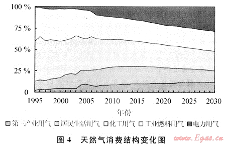 目前我國天然氣消費(fèi)主體為化工用氣與工業(yè)燃料用氣,發(fā)電用氣、第三產(chǎn)業(yè)用氣以及居民生活用氣的比例相對較小。隨著天然氣消費(fèi)總量的增長,消費(fèi)結(jié)構(gòu)也將發(fā)生很大的變化,如圖4所示。