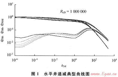 2) 通過計(jì)算,給出了水平氣井的產(chǎn)量遞減典型曲線圖版,可以看出,產(chǎn)量導(dǎo)數(shù)曲線分為3個(gè)階段,早期為垂直徑向流階段;中期為平面徑向流階段,有一明顯的“臺(tái)階”特征;晚期為擬穩(wěn)態(tài)流階段,產(chǎn)量急劇下降。
