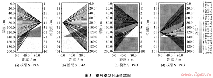 圖3為兩個(gè)楔形模型的射線追蹤圖,比較可以發(fā)現(xiàn),對(duì)于尖滅傾斜層來說,激發(fā)井相對(duì)地層為下傾或接收井相對(duì)地層為上傾時(shí)(圖3-b、圖3-d),其經(jīng)過尖滅傾斜層射線明顯多于上傾激發(fā)或上傾接收(圖3-a、圖3-c)。顯而易見,利用下傾激發(fā)上傾接收的井間資料進(jìn)行偏移成像或?qū)游龀上?,其得到的結(jié)果肯定優(yōu)于上傾激發(fā)下傾接收的結(jié)果。圖4是與圖3-c、3-d對(duì)應(yīng)的物理模型實(shí)驗(yàn)炮集記錄,也表現(xiàn)出同樣的結(jié)果。數(shù)值模擬和物理模擬結(jié)果均表明下傾激發(fā)、上傾接收得到的井間記錄能更好地反映井間介質(zhì)的變化。