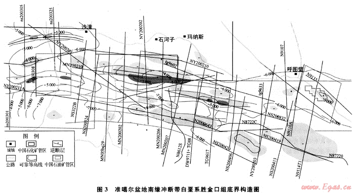 通過(guò)對(duì)基準(zhǔn)面統(tǒng)一處理后的資料進(jìn)行連片解釋及變速成圖,獲得的成果圖構(gòu)造形態(tài)自然,無(wú)畸變現(xiàn)象(圖3),且欲鉆井吻合較好。地質(zhì)成果進(jìn)一步查明了南緣沖斷帶的構(gòu)造圈閉形態(tài)、斷裂展布特征;重新落實(shí)了安集海構(gòu)造、霍爾果斯構(gòu)造、瑪納斯構(gòu)造、吐谷魯構(gòu)造、呼圖壁構(gòu)造、東灣構(gòu)造的構(gòu)造形態(tài)、高點(diǎn)位置、圈閉規(guī)模;新發(fā)現(xiàn)了霍爾果斯下盤(pán)構(gòu)造、瑪納斯下盤(pán)構(gòu)造、吐谷魯下盤(pán)構(gòu)造和瑪北構(gòu)造。通過(guò)構(gòu)造圈閉評(píng)價(jià),指明了瑪納斯構(gòu)造、吐谷魯構(gòu)造、呼圖壁構(gòu)造為該區(qū)油氣勘探的最有利的鉆探目標(biāo)區(qū),同時(shí)瑪北構(gòu)造和安集海構(gòu)造為該區(qū)次一級(jí)的油氣勘探的鉆探目標(biāo)區(qū),并提供了3口建議井位,為南緣地區(qū)的勘探開(kāi)發(fā)提供了重要的基礎(chǔ)資料,對(duì)南緣沖斷帶下步勘探部署具有指導(dǎo)意義,效果顯著。
