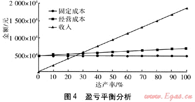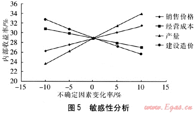 盈虧平衡分析主要是測算項(xiàng)目投產(chǎn)后盈虧平衡點(diǎn)(BEP),以考察項(xiàng)目對風(fēng)險的承受能力。圖4為該項(xiàng)目的盈虧平衡分析,分析了固定成本、經(jīng)營成本、收入和達(dá)產(chǎn)率的關(guān)系。從圖4可以看出,在達(dá)產(chǎn)率為28%時,收支相抵,當(dāng)達(dá)產(chǎn)率超過28%時,就可以實(shí)現(xiàn)贏利。