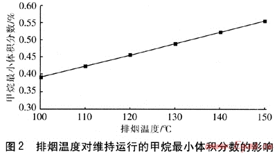 ② 排煙溫度對維持運(yùn)行的甲烷最小體積分?jǐn)?shù)影響較大,當(dāng)排煙溫度在100~150℃時,維持運(yùn)行的最小體積分?jǐn)?shù)為0.38%~0.56%,且隨排煙溫度的增加以線性關(guān)系遞增。